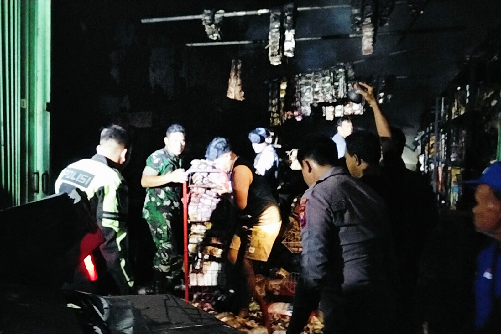 “Kami bersama Damkar dan warga berusaha sekuat tenaga memadamkan api agar tidak merembet ke bangunan lain,” ujar Serka Supriyanto di lokasi kejadian. Ia tampak turut mengangkat karung sembako dan barang dagangan yang masih bisa diselamatkan di tengah asap pekat dan suhu panas.