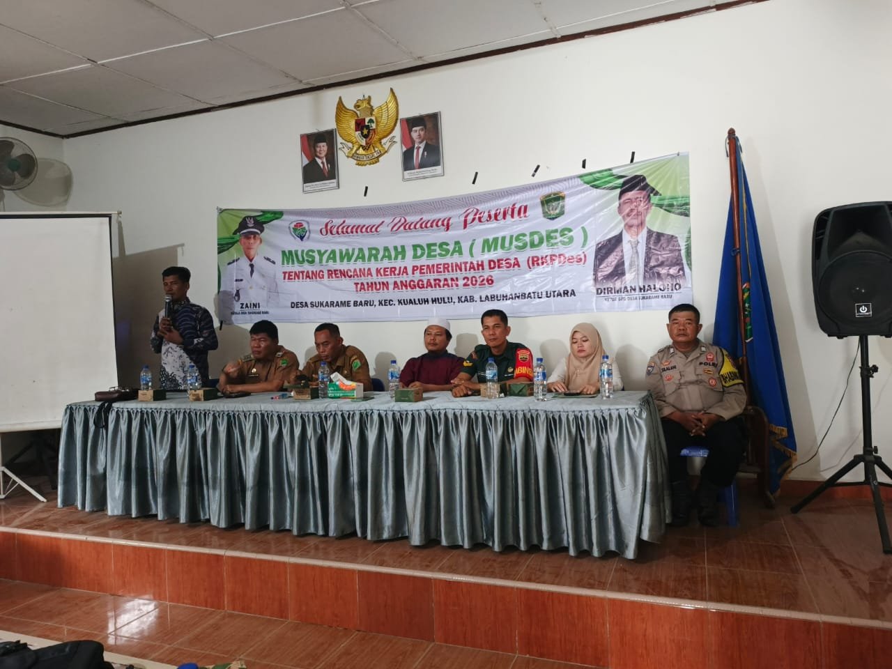 Labuhanbatu Utara – Dalam rangka mewujudkan kekeluargaan dan keharmonisan dalam sosial di masyarakat, Babinsa Koramil 01/AK Kodim 0209/LB Sertu GM. Simatupang menghadiri musyawarah kerja pemerintah desa Sukarame Baru Kecamatan Kualuh Hulu Kabupaten Labuhanbatu Utara, pada Senin (3/11/2025)