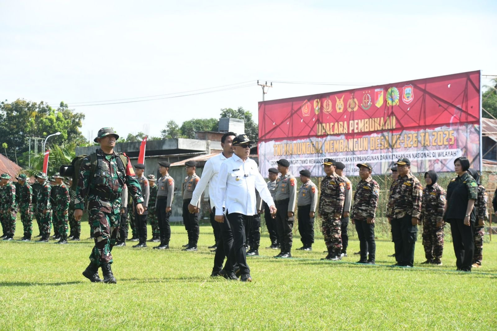 GORONTALO– Danrem 133/Nani Wartabone Brigjen TNI Hardo Sihotang yang diwakili oleh Kasrem 133/NW Kolonel Inf Parsaoran Sirait, S.A.P., M.M., menghadiri upacara pembukaan TNI Manunggal Membangun Desa (TMMD) ke-126 Tahun Anggaran 2025 di Lapangan Desa Tuladenggi, Kecamatan Telaga Biru, Kabupaten Gorontalo, Rabu (8/10/2025).