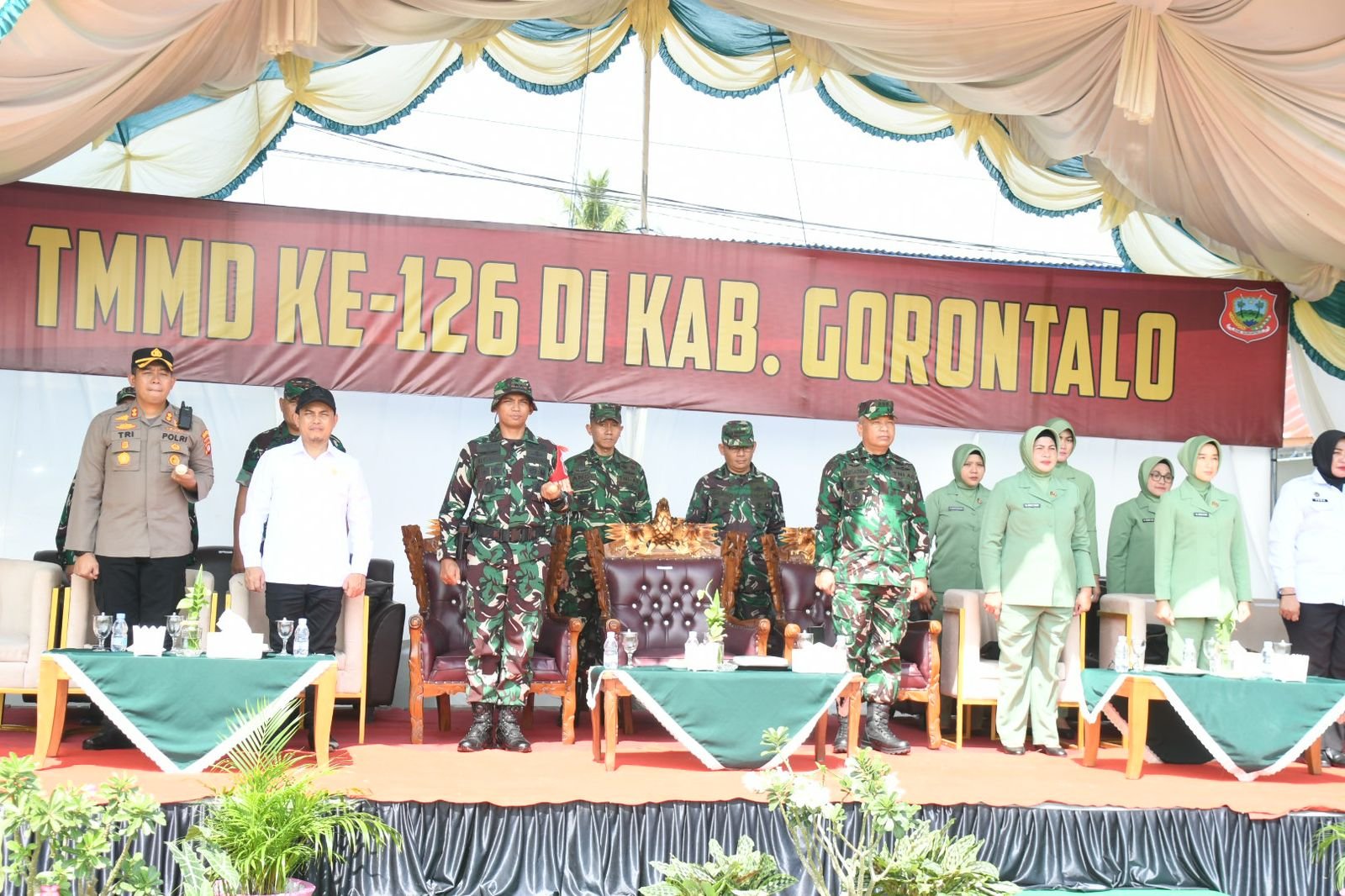 Dalam sambutannya, Bupati Gorontalo H. Sofyan Puhi, S.T., menyampaikan apresiasi kepada TNI atas pelaksanaan TMMD di wilayahnya. Ia menegaskan bahwa TMMD merupakan program lintas sektoral yang mencerminkan kemanunggalan TNI dan rakyat dalam membangun bangsa. “Kita tidak lagi berperang melawan penjajah, tetapi hari ini kita berjuang melawan kemiskinan, keterisolasian, dan ketertinggalan infrastruktur,” ujarnya.