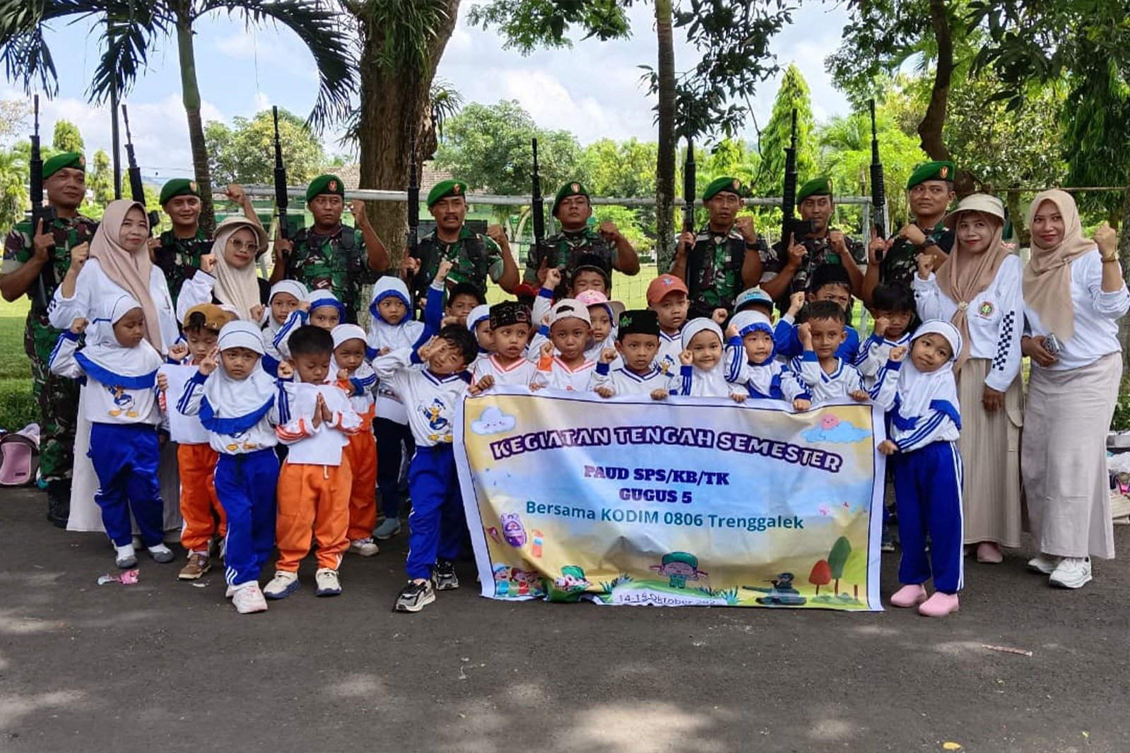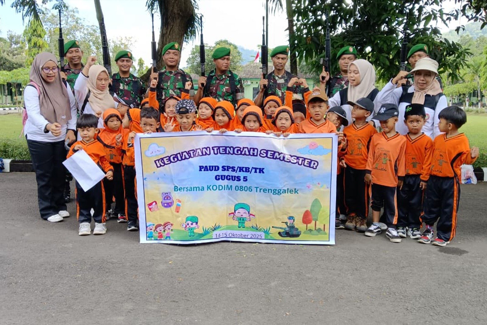 Hari ini, Rabu (15/10/2025), giliran PAUD Gugus 5 Kecamatan Pogalan yang berkesempatan mengikuti kegiatan outing class di Markas Kodim 0806/Trenggalek. Sejak pagi, halaman Makodim tampak semarak oleh tawa ceria anak-anak berpakaian seragam warna-warni. Mereka disambut ramah oleh para prajurit yang telah menyiapkan berbagai kegiatan edukatif dengan nuansa nasionalisme yang menyenangkan.