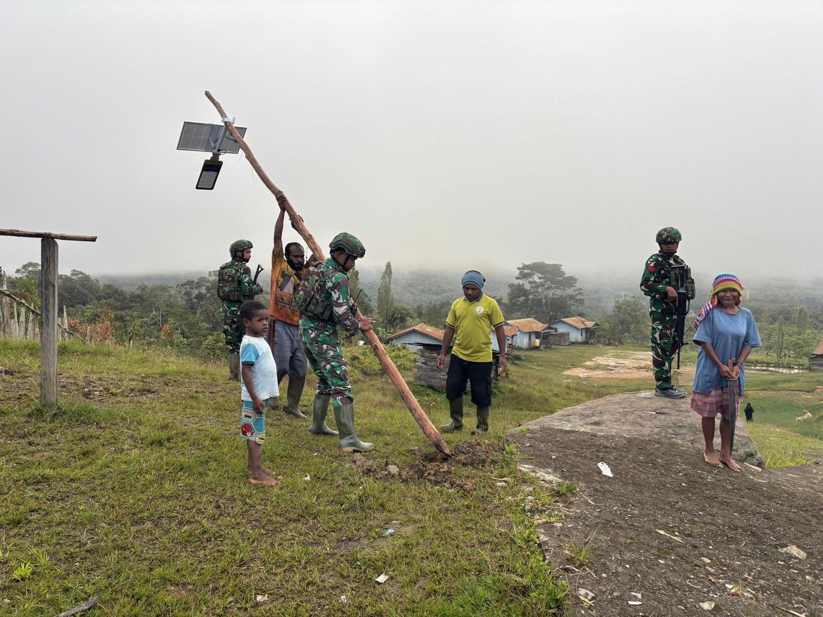 Serambakon, Papua Pegunungan — Tentara Nasional Indonesia (TNI) melalui Pos Serambakon memasang lampu solar cell di Kampung Seramkatop, Distrik Serambakon, sebagai wujud kepedulian terhadap masyarakat pedalaman yang selama ini terbatas akses penerangan. Kegiatan dipimpin langsung Danpos Serambakon Letda Inf Ilham Putra (Minggu,5/10/2025).