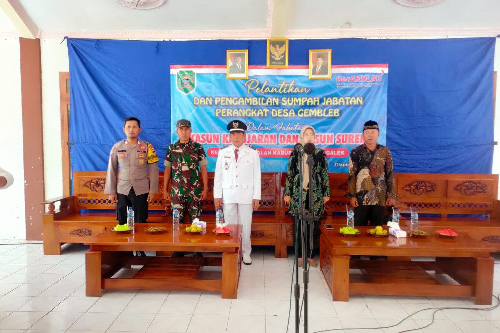 Trenggalek – Sinergitas TNI, Polri, dan Pemerintah Daerah kembali menegaskan komitmen kuat dalam memperkuat pemerintahan desa berbasis pelayanan publik dan ketahanan sosial masyarakat. Kolaborasi strategis tersebut tampak nyata dalam Upacara Sumpah Janji Pelantikan Perangkat Desa Gembleb, Kecamatan Pogalan, Trenggalek, Minggu (19/10/2025), yang berlangsung khidmat, tertib, dan penuh semangat kebersamaan.