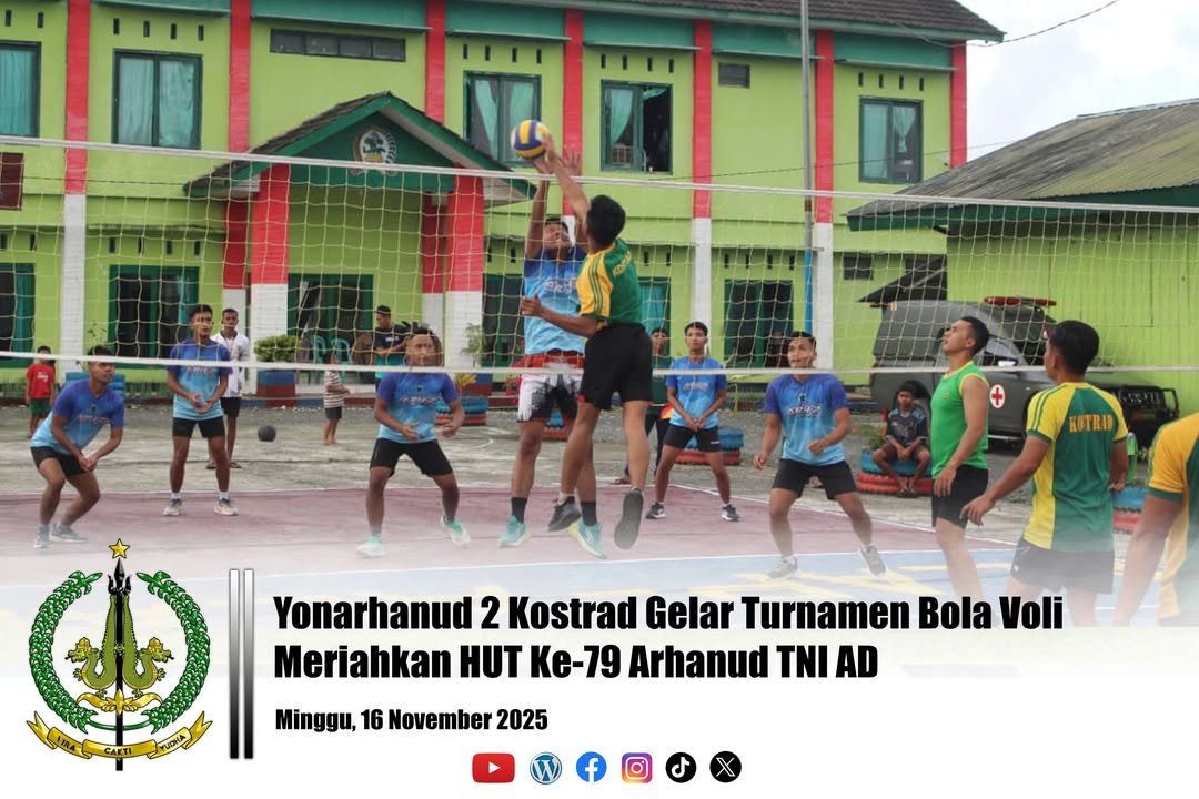 Eban – Satgas Pamtas RI-RDTL Sektor Barat Yonarhanud 2 Kostrad menggelar turnamen bola voli dalam rangka memperingati HUT ke 79 Arhanud TNI AD yang dilaksanakan di Makosatgas Pamtas, Desa Eban, Kec. Miomaffo Barat, Kab. TTU. Minggu (16/10/2025).