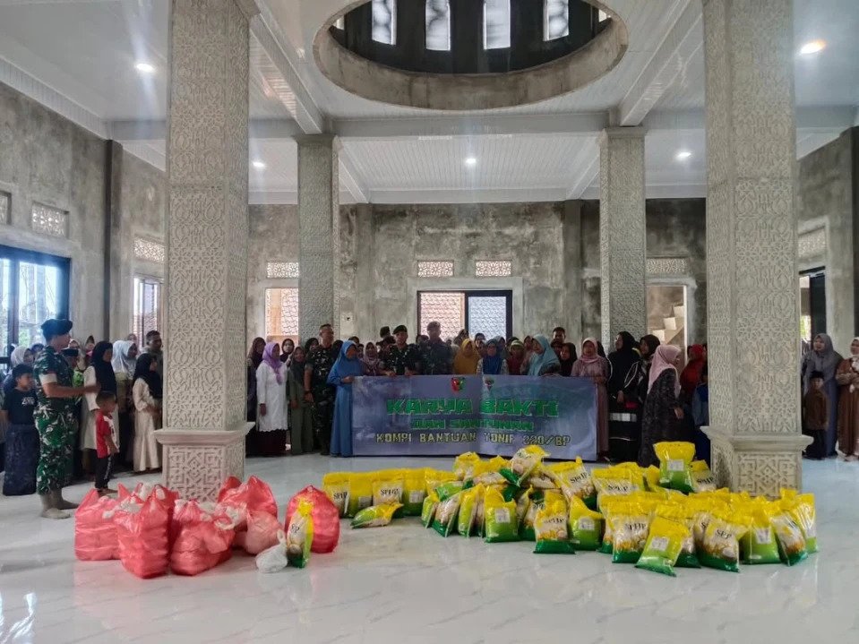 Pandeglang — Dengan semangat pengabdian tanpa batas, prajurit Kompi Bantuan Yonif 320 Kostrad menggelar karya bakti serta penyaluran santunan bagi masyarakat Kampung Gayam Masjid, Desa Cadasari, Pandeglang, Banten. Jumat (14/11/2025).